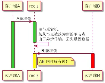 前面的场景中都假设了Redis服务能够正常运行,但如果发生了主节点的切换,由从节点顶上,仍可能导致多客户端都认为自己持有锁的情况。