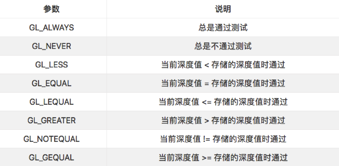 我们也可以通过glDepthFunc(GLenum func)来修改深度测试的测试规则(一般不会对规则进行修改)