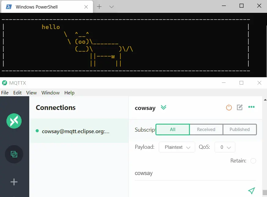 client.publish('cowsay', 'Hello mqtt')