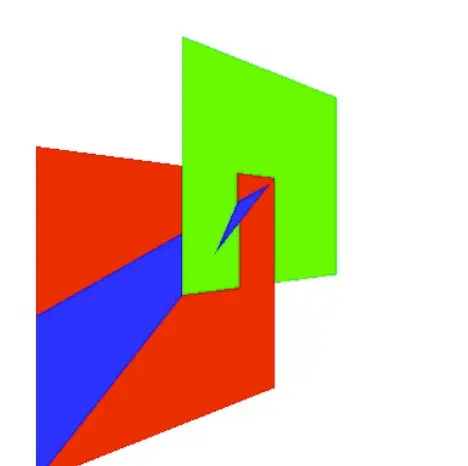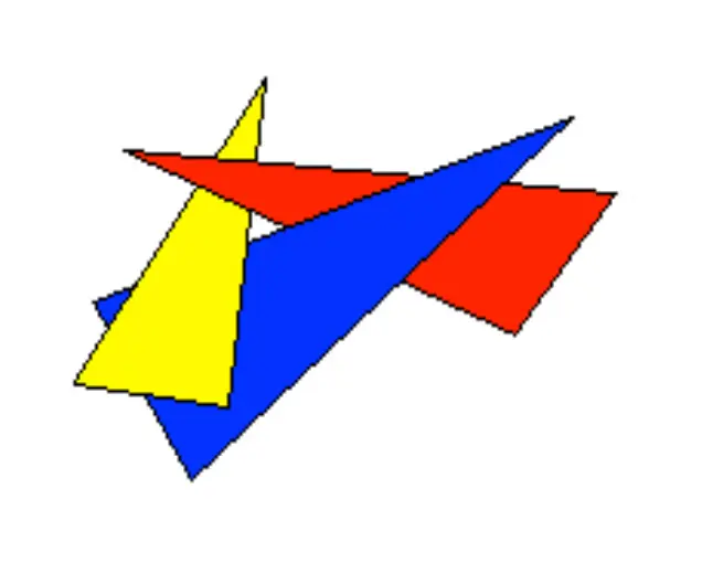 油画算法 说到这个问题,我们先看通常情况下油画是怎么绘制 先绘制场景中的离观察者较远的物体,再绘制较近的物体. 例如下⾯的图例: 先绘制红⾊部分,再绘制⻩⾊部分,最后再绘制灰⾊部分,即可解决隐藏⾯消除的问题