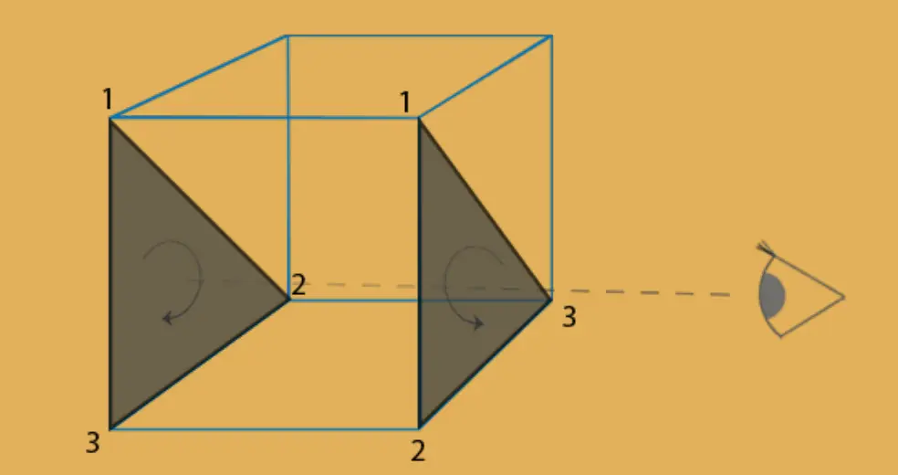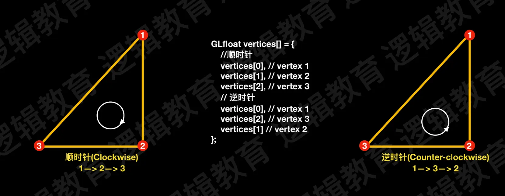 1、左侧三⻆形顶点顺序为: 1—> 2—> 3 ; 右侧三⻆形的顶点顺序为: 1—> 2—> 3