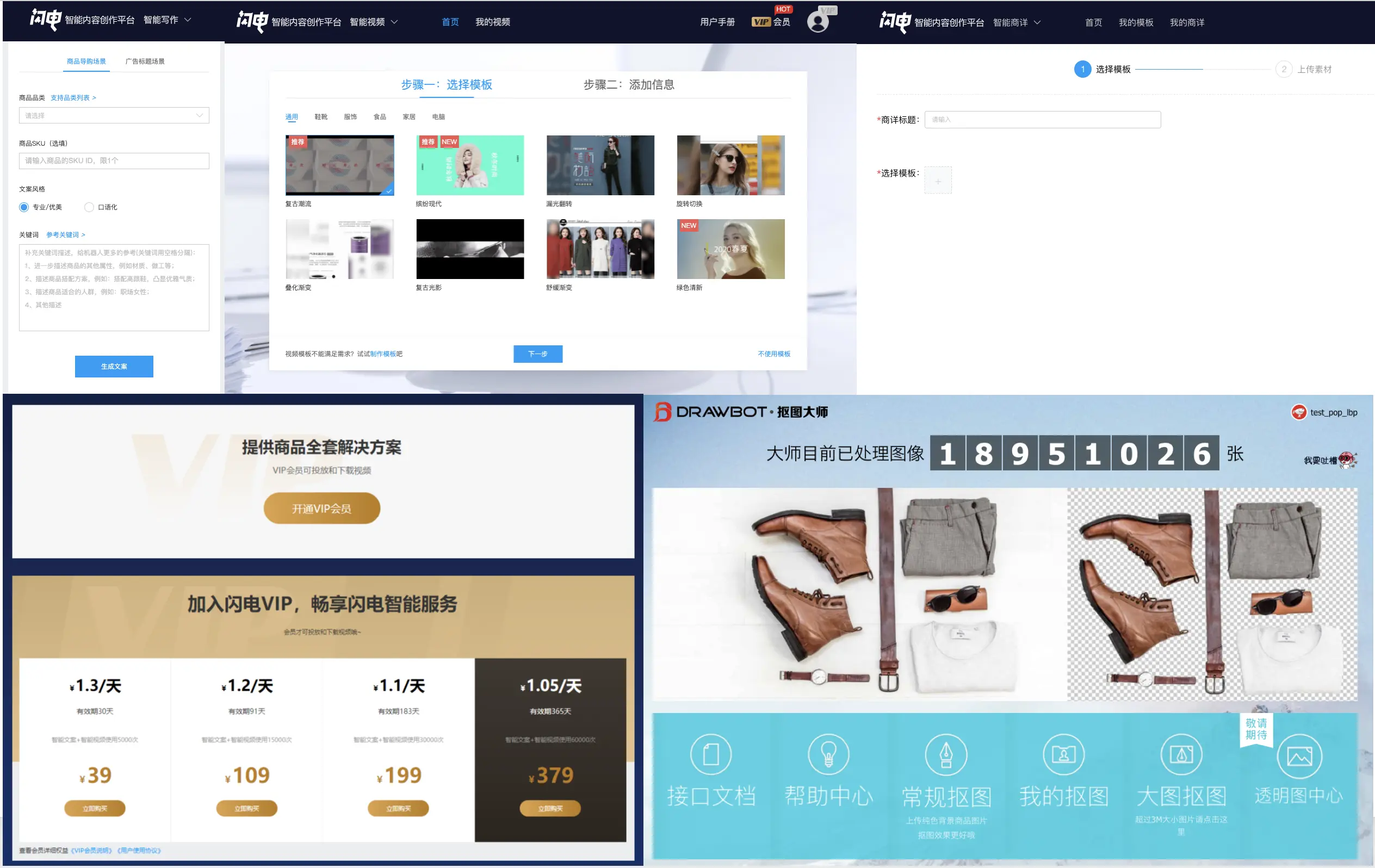 闪电平台推出的时候新增了视频模块,有了第一版的视频生成和视频编辑,在一年多时间里的多次版本迭代,新增了会员体系、智能商详、智能图片、闪电实验室等模块。