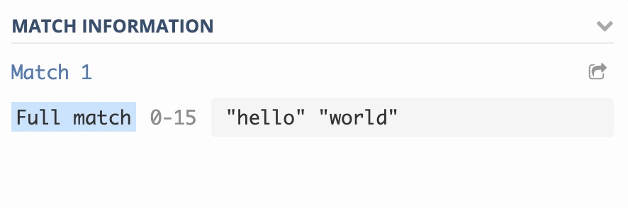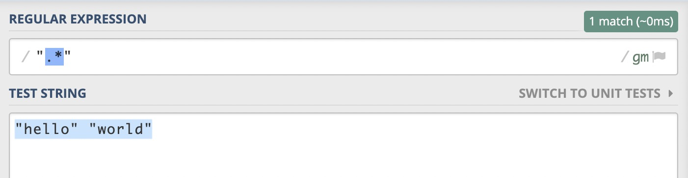那如果我将测试用例变为"hello" "world",我们会发现上面的正则表达式还是可以匹配整个测试用例,但是却不是我们想要的结果。我们希望的是能够分别匹配"hello"和"world"而不是这个整体。