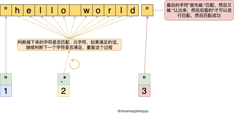 "开始进行匹配,发现h不满足匹配,于是需要进行回溯。也就是.*?要尝试匹配满足条件的字符,为了后面的"能够匹配成功。于是.*?匹配了h,后面的"发现下一个字符是e,还是不可以匹配成功,然后再次进行回溯。一直到.*?匹配了hello,正则表达式的"发现此时后面的"是可以匹配成功的,至此整个表达式匹配成功了一次。第四步:在接下来的字符串中,重复上述的1-3步骤,一直到字符串的结尾。