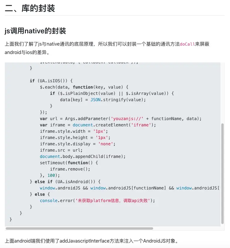 通过schema方式,使用shouldOverrideUrlLoading方法对url协议进行解析。这种js的调用方式与ios的一样,使用iframe来调用native代码