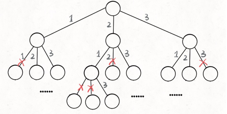 你选择就在做决策,可以选择 1 那条树枝,也可以选择3那条树枝。为啥只能在1 和 3 之中选择呢?因为 2 这个树枝在你身后,这个选择你之前做过了,而全排列是不允重复使用数字的。