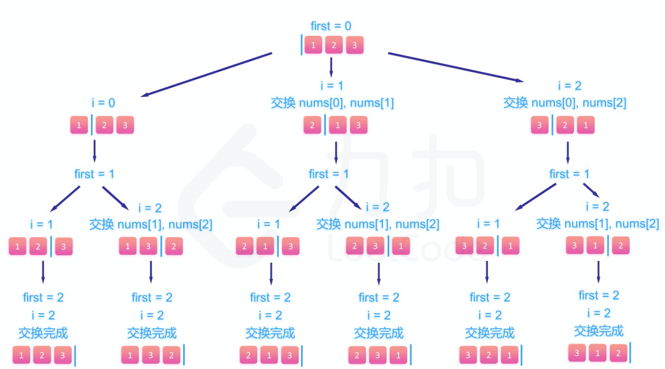 我们定义的 backtrack 函数其实就像一个指针,在这颗树上游走,同时要正确维护每个节点的属性,每当走到树的底层,其「路径」就是一个全排列。