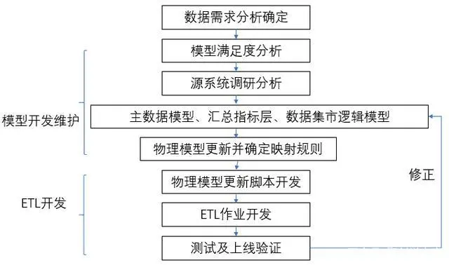 之前已经提到数据仓库从头建设的流程,那现在以某个数据应用对数据仓库提出需求来看整个系统维护的开发流程,主要步骤如下: