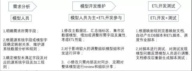 数据仓库团队主要分为模型人员、ETL开发人员和测试人员,其中模型人员主要是进行需求分析和模型维护,ETL开发人员负责代码实现和系统维护,开发流程中各角色工作如下: