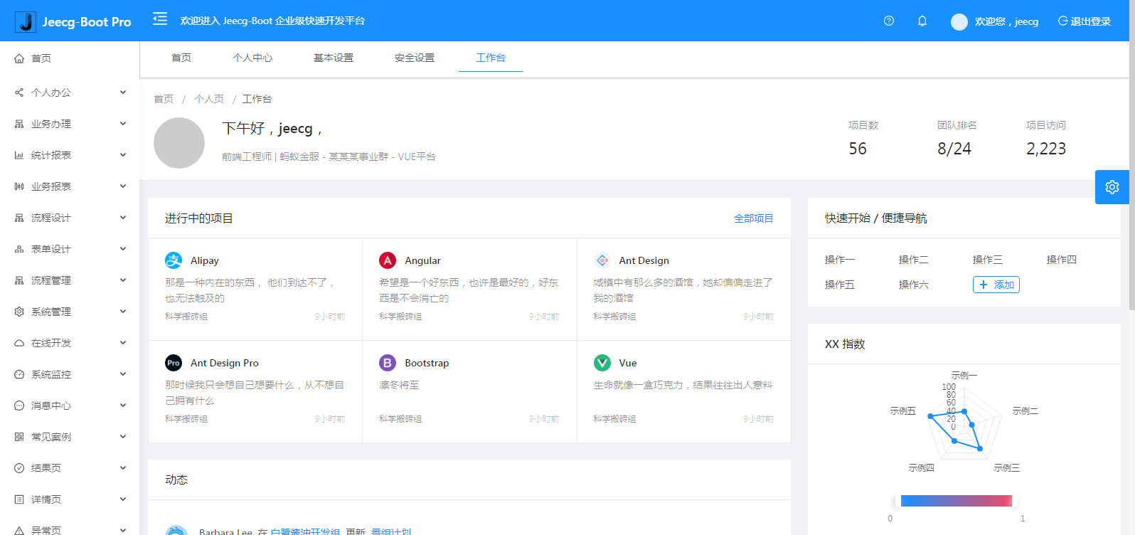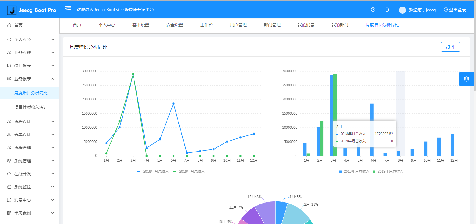 JeecgBoot是一款基于代码生成器的低代码开发平台,开源界“小普元”超越传统商业企业开发平台!采用前后端分离架构:SpringBoot 2.x,Ant Design&Vue,Mybatis-Plus,Shiro,JWT。强大的代码生成器让前后端代码一键生成,无需写任何代码! 引领新的低代码开发模式(OnlineCoding模式-> 代码生成器模式-> 手工MERGE智能开发),帮助Java项目解决70%的重复工作,让开发更多关注业务逻辑。既能快速提高开发效率,帮助公司节省成本,同时又不失灵活性。JeecgBoot还独创在线开发模式(低代码):在线表单、在线报表、在线图表、在线工作流、插件能力等等。。