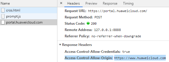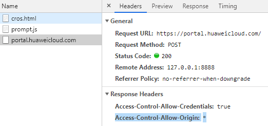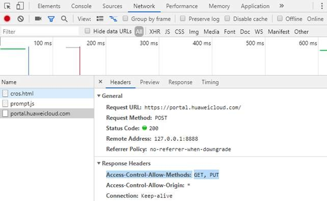 从www.huaweicloud.com,跨域访问portal.huaweicloud.com,HTTP方法为POST,如果服务器响应里没有Access-Control-Allow-Methods,跨域请求能够成功: