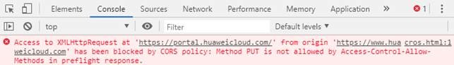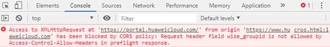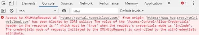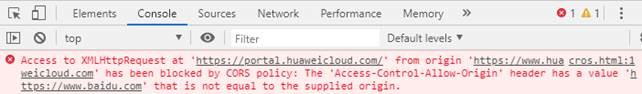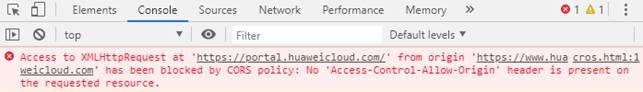 从www.huaweicloud.com网页,发送portal.huaweicloud.com请求,如果服务器响应头域中没有填写Access-Control-Allow-Origin,浏览器会报错: