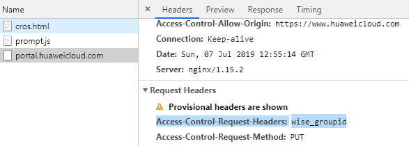 如果在XMLHttpRequest中设置了wise_groupid字段,而服务器响应中,没有Access-Control-Allow-Headers头域,或者Access-Control-Allow-Headers头域的值不包含wise_groupid,则浏览器会报错: