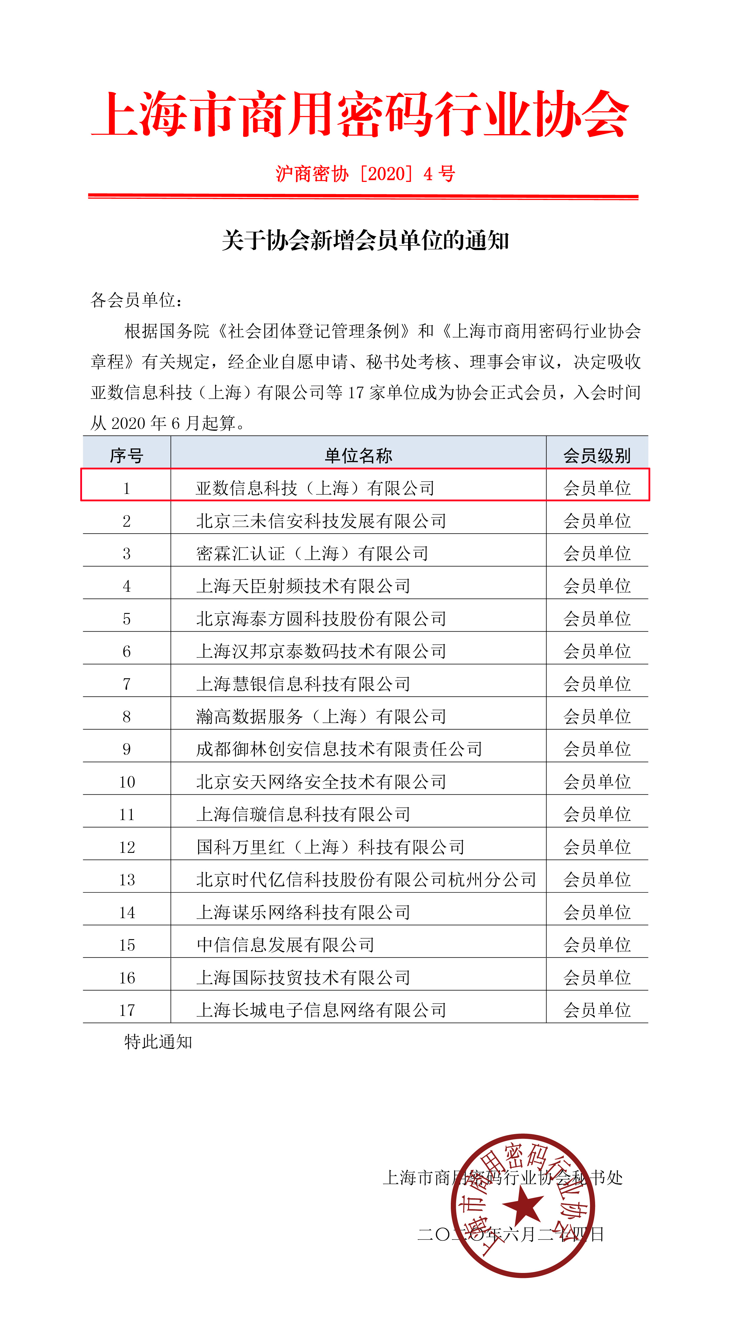 6月24日,经过上海市商用密码行业协会秘书处、理事会的深入考核及严格评审后,亚数信息科技(上海)有限公司【以下简称:亚洲诚信】被正式获批成为协会会员单位。