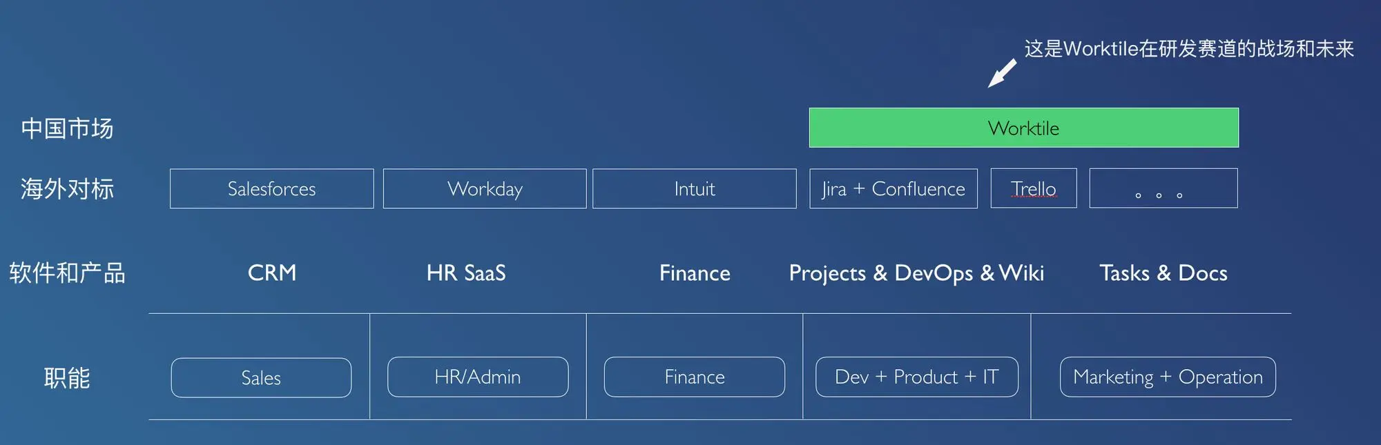 “我们想创立一家有价值、有意义、有影响的公司,可以慢点,但必须走的足够远。”这是Worktile创立的初衷。Worktile 不断地超越自我,实现了新的突破,但不变的是我们始终以服务好客户,满足客户价值,提供世界级的产品作为产品和公司发展的基础宗旨。Worktile将坚持以“通用协作+软件研发”两条产品线并行发展,希望为以软件开发和协作为基础的企业数字化未来,提供最好的SaaS工具和生态。从全球市场来看,以Jira和Confluence为代表的研发管理工具在海外市场占有很高的领先优势,而国内将同样存在复制这个市场的过程和差异,贸易战带来的科技国产化趋势也将加剧国内科技公司在工具基础设施的投入,Worktile将立足国内1000万软件开发者群体,打造世界级的敏捷开发与研发管理工具矩阵。