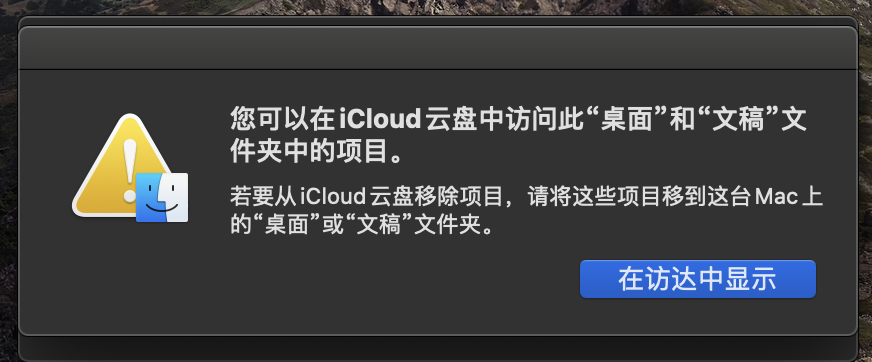 我使用的是第2条方法,不过要注意:关闭桌面与文稿时系统会提示“桌面”与“文稿”里的项目将会从这台Mac上移除,继续关闭会发现你的电脑桌面和文稿空了,什么都没了。不用担心,文件只并没有被删除,在访达-->>iCloud云盘里还可以看到“桌面”与“文稿”。根据提示把“桌面”与“文稿”里的文件移到Mac的“桌面”与“文稿”文件夹就可以了。提示如下图: