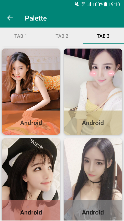 Palette.Builder生成器类,生成 Palette 实例Palette.Filter过滤器接口,使 Palette 有更加细腻的颜色过滤Palette.PaletteAsyncListener异步加载监听pattle.Swatch提供获取结果的色彩样本from(List<Palette.Switch> switches)通过预设的 Palette.Swatch 颜色样本列表 来生成 Palettefrom(Bitmap bitmap)通过返回 Palette.Builder 实例来构建 Palettepalette.getDarkMutedColor(Color.BLUE)获取到柔和的深色的颜色(可传默认值)palette.getDarkVibrantColor(Color.BLUE)获取到活跃的深色的颜色(可传默认值)palette.getLightMutedColor(Color.BLUE)获取到柔和的明亮的颜色(可传默认值)palette.getLightVibrantColor(Color.BLUE)获取到活跃的明亮的颜色(可传默认值)palette.getVibrantColor(Color.BLUE)获取图片中最活跃的颜色(也可以说整个图片出现最多的颜色)(可传默认值)palette.getMutedColor(Color.BLUE)获取图片中一个最柔和的颜色(可传默认值)