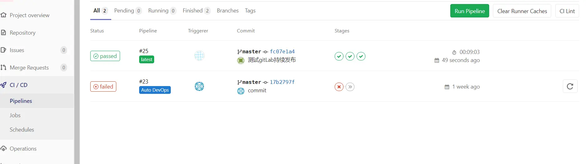 在项目的根目录配置新建一个.gitlab-ci.yml文件,里面编辑文本,提交到gitlab,gitlab会根据文本里面的内容执行命令,具体的语法看官网链接 gitLab官网说明 文件上传后,gitLab > CI/CD > Pipelines 就会出现如下任务