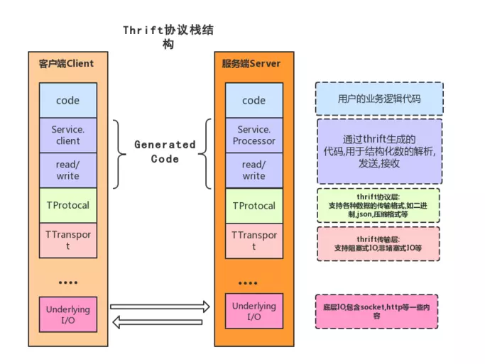 我们使用的代码都是使用Thrift自动为我们生成出来的,说白了,就是我们只需要根据业务逻辑定义好 .thrift 文件,通过这个它的编译器编译这个配置文件,并且使用告诉编译器为我们生成什么语言的代码就ok了,Thrift 框架会自动的将双方通信的编解码的逻辑生成在给我们的代码中,还包含对socket的封装,整体是一条龙的服务