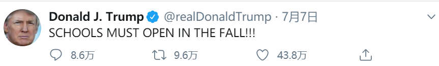 总统特朗普也在推特上强烈要求“学校必须要在秋季开放”,并且“关爱”了学生们的家庭,认为即刻开学是有利于他们的。