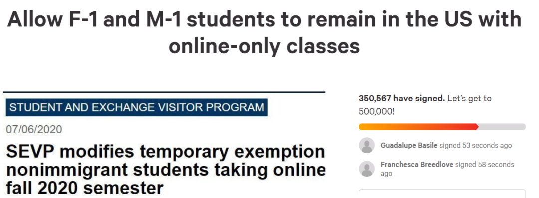 好在社会各界极重视留学生的影响,马上就抗议政策的不合理,这条请愿不出四天就集齐了超过35w人的签名,最终逼迫ICE修改新规。