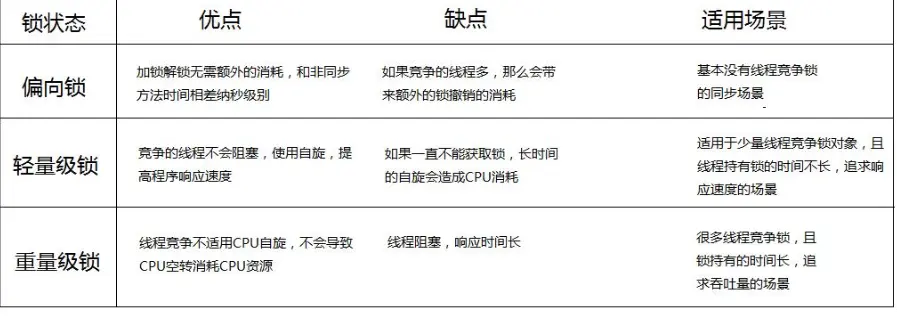 偏向锁性能最好,可以避免执行 CAS 操作。而轻量级锁利用自旋和 CAS 避免了重量级锁带来的线程阻塞和唤醒,性能中等。重量级锁则会把获取不到锁的线程阻塞,性能最差。