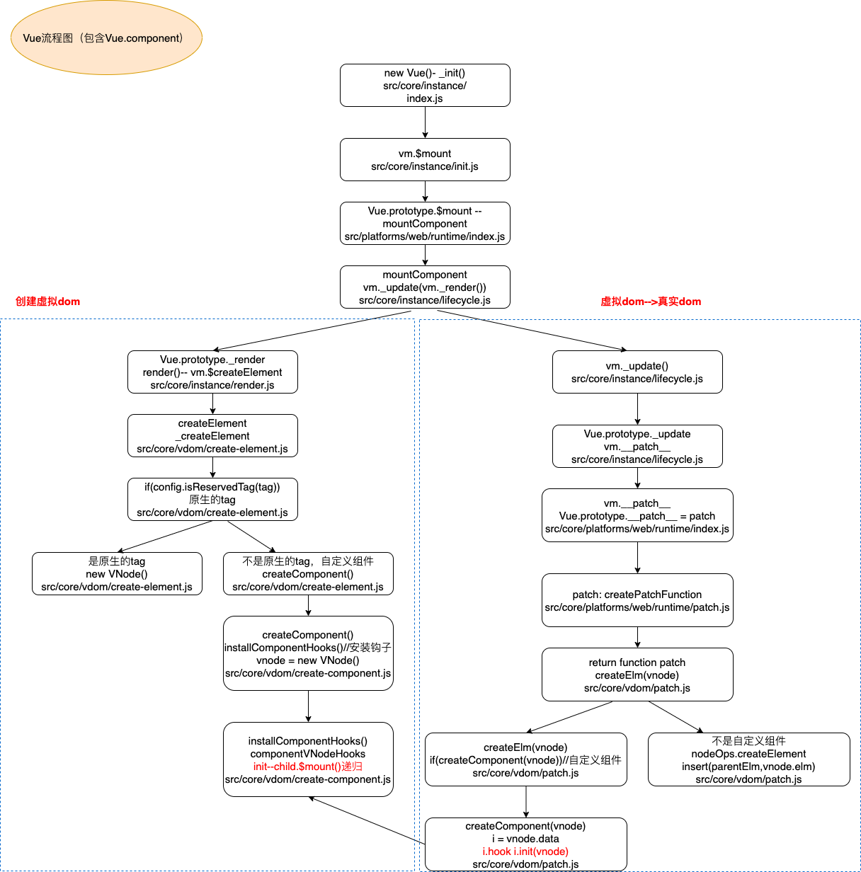 图解vue源码---初始化流程 沐言 2020-07-13 131 阅读1分钟 通过源码的学习,逐渐了解到vue的初始化流程 下面出一张图来看看从new Vue() 来看看流程图 上图就是一个源码中的流程图 后续继续分析当数据变化的时候,怎么做到响应式的
