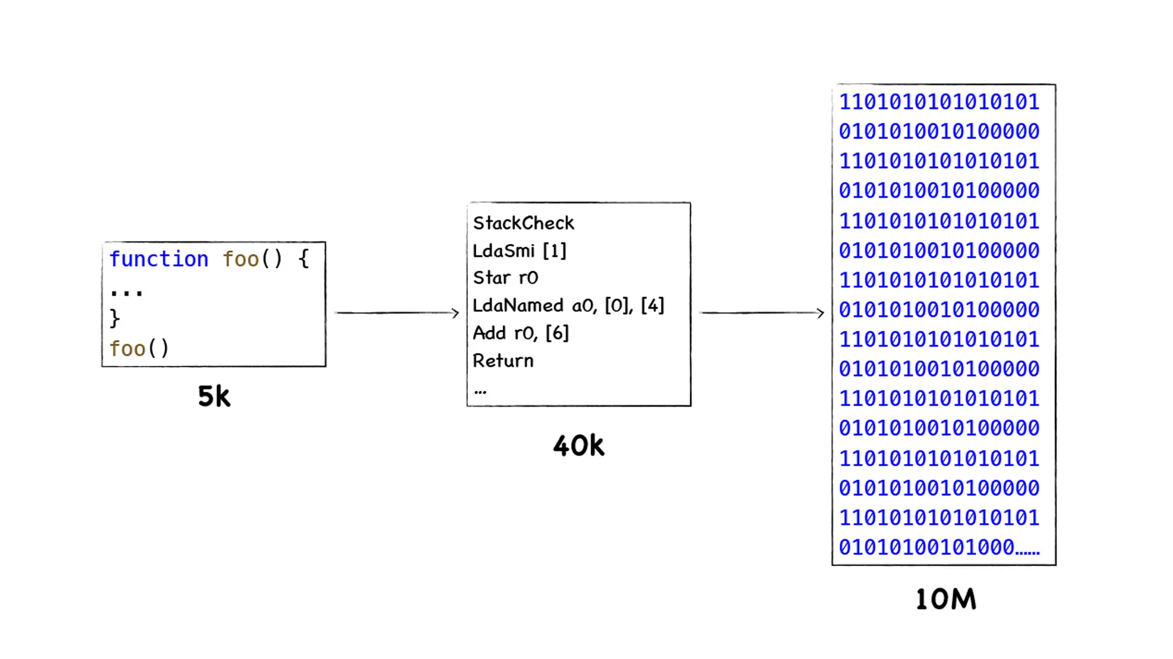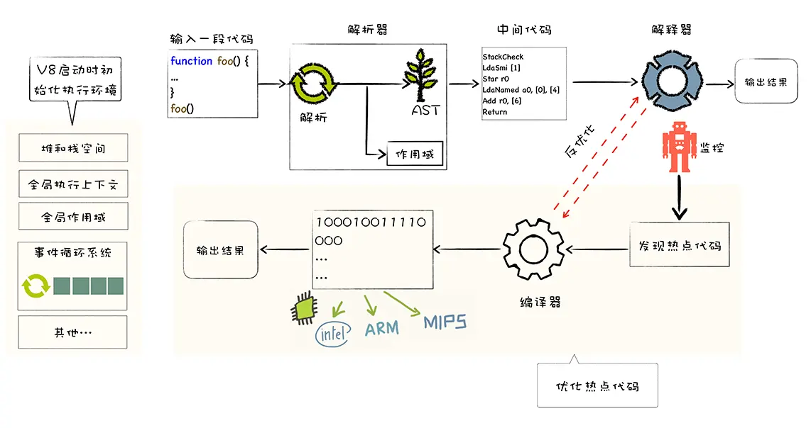 我们知道 V8 在执行一段 JavaScript 代码之前,需要将其编译为字节码,然后再解释执行字节码或者将字节码编译为二进制代码然后再执行。所谓字节码,是指编译过程中的中间代码,你可以把字节码看成是机器代码的抽象,在 V8 中,字节码有两个作用:第一个是解释器可以直接解释执行字节码 ;第二个是优化编译器可以将字节码编译为二进制代码,然后再执行二进制机器代码