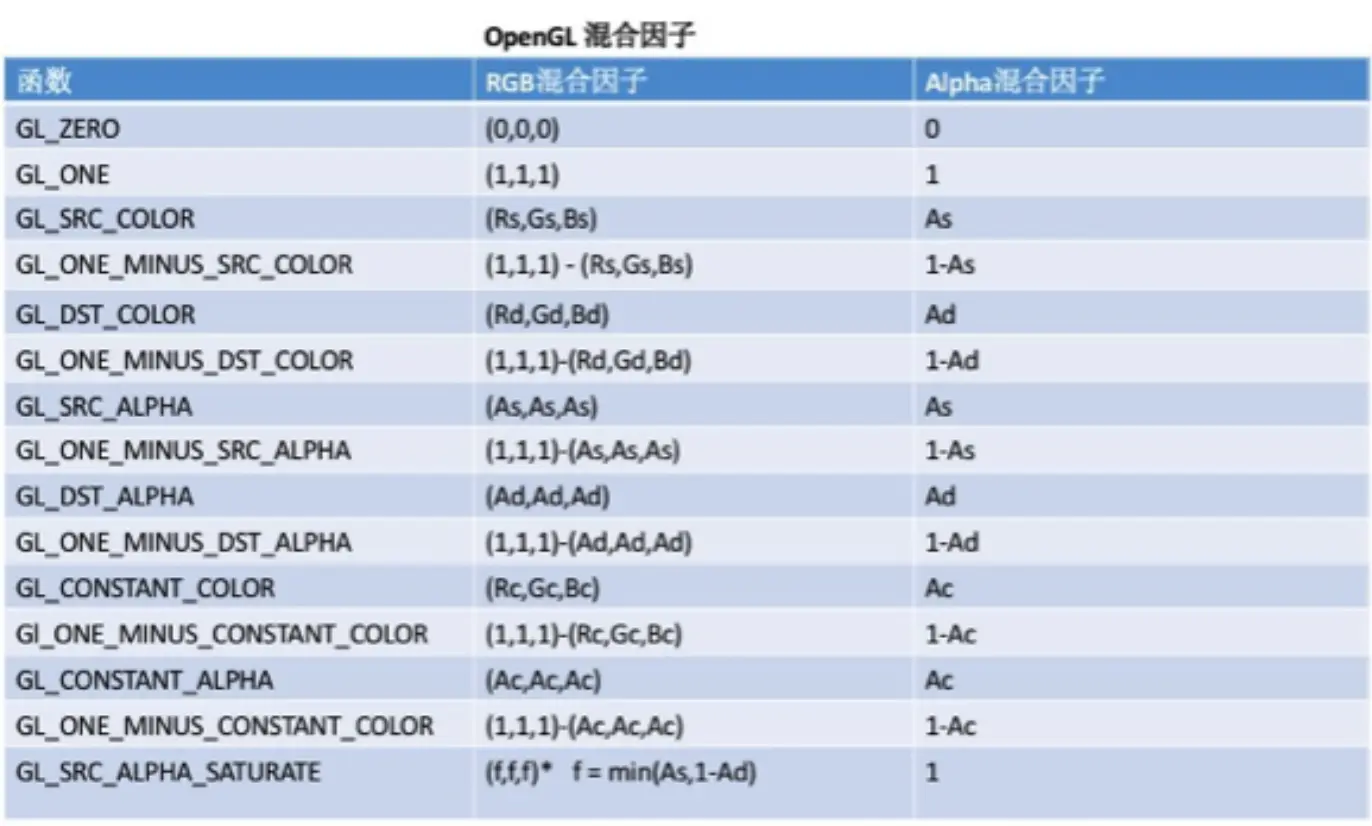 OpenGL中可设置的混合因子,见下图:
