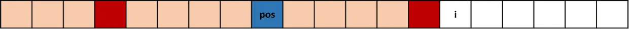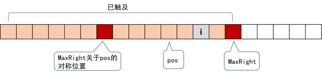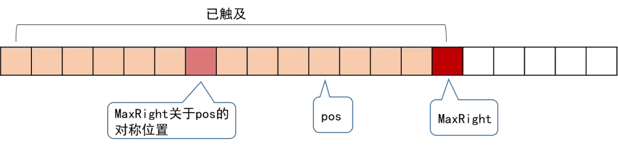 我们引入一个辅助变量 MaxRight,表示当前访问到的所有回文子串,所能触及的最右一个字符的位置。另外还要记录下 MaxRight 对应的回文串的对称轴所在的位置,记为 pos,它们的位置关系如下: