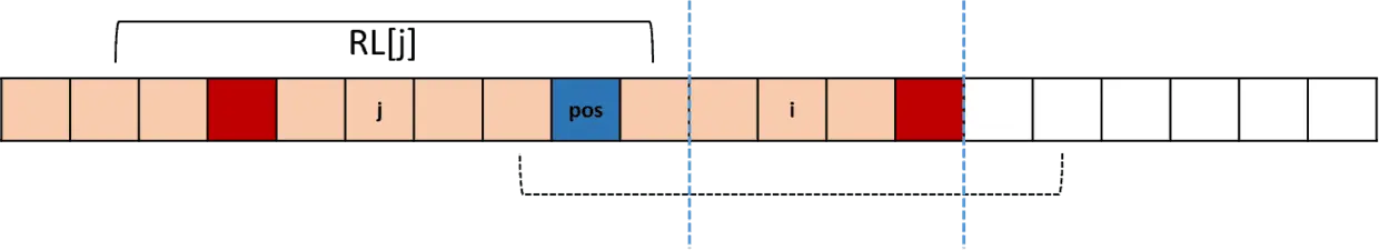 i 关于 pos 的对称位置 j ,这个j对应的 RL[j] 我们是已经算过的。根据回文串的对称性,以 i 为对称轴的回文串和以 j 为对称轴的回文串,有一部分是相同的。