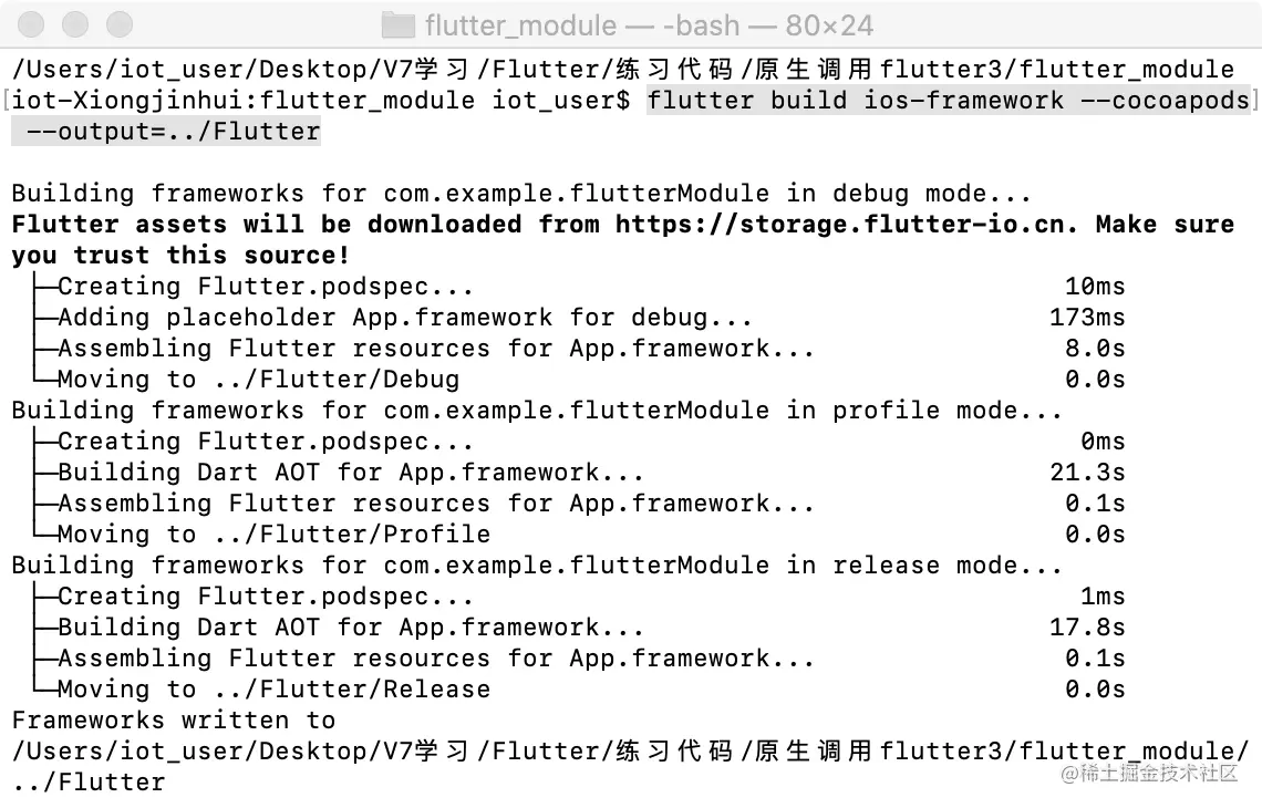 终端cd到flutter module文件所在的目录,输入如下指令生成cocoapods下的framework文件