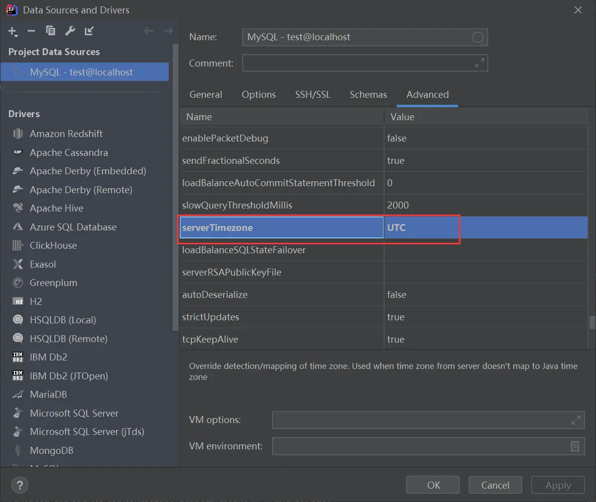 [IDEA] 使用IDEA连接Mysql数据库时报错:Server returns invalid timezone. Go to 'Advanced' tab BuleZst 2020-07-14 377 阅读1分钟 在标题中报错信息没有显示全: Server returns invalid timezone. Go to 'Advanced' tab and set 'serverTimezone' property manually. 解决方法: 打开Advanced界面,将serverTimezone设置成UTC,如图。