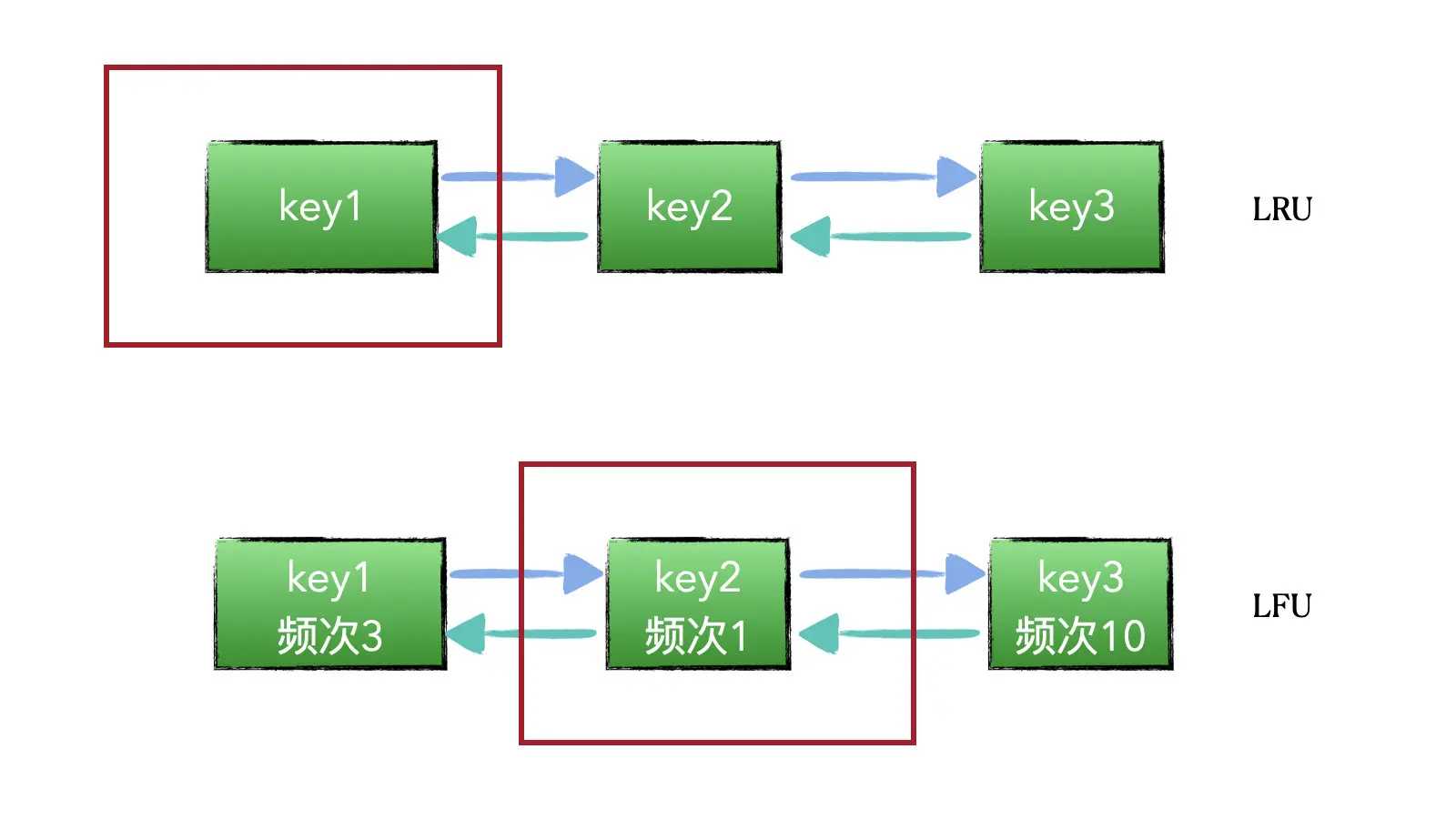 看下图,举个例子来说,假设现在 put 进来一个键值对,并且超过了最大的容量,那就要删除一个键值对。假设 key2 是在 5 分钟之前访问过一次,而 key1 是在 10 分钟之前访问过,以 LRU 的策略来说,就会删除头节点,也就是图中的 key1。但是如果是 LFU 的话,会记录每个 key 的访问频次,虽然 key2 是最近一次访问晚于 key1,但是它的频次比 key1 少,那要淘汰一个 key 的话,还是要淘汰 key2 的。只是举个例子,真正的 LFU 数据结构比 LRU 要复杂。