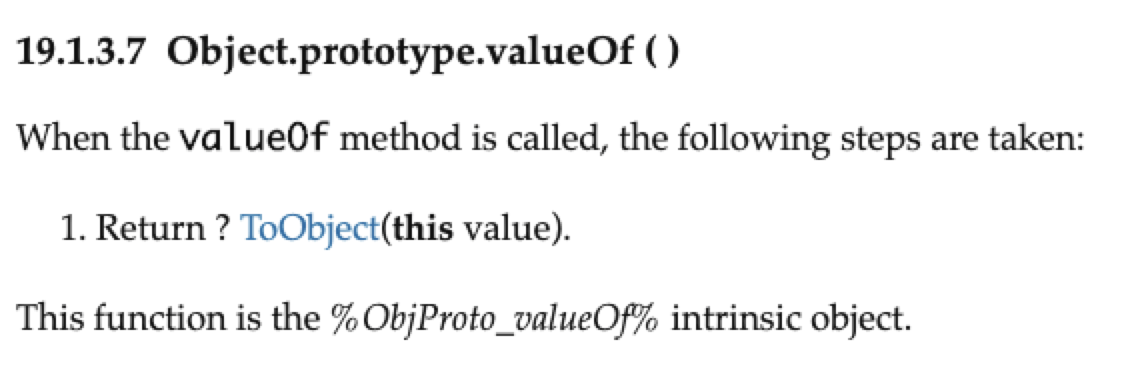 [].valueOf()注意, Array.prototype 没有实现 valueOf 方法, 是继承自 Object.prototype 的, 所以我们还需要看一下 Object.prototype.valueOf 返回了什么 你可以看到其返回了 ToObject(this value), 这里 this 指向的就是