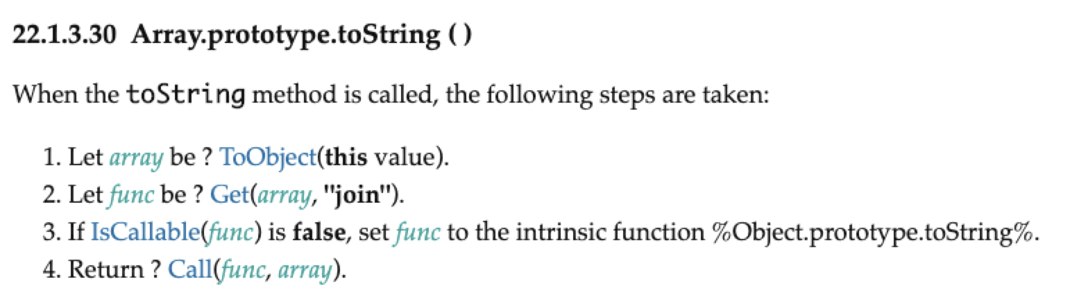 Array.prototype.join,join方法我不再赘述, 空数据会返回一个空字符串'', OK, 回到 OrdinaryToPrimitive 算法中,''空字符串不再是 Object, 将其返回