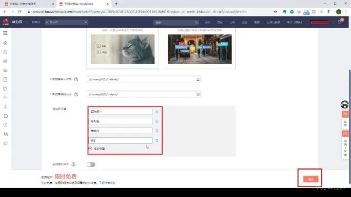 首先,在华为云OBS存储服务建一个新的桶(可以理解成文件夹)。创建成功后点击界面左侧“对象”,新建一个文件夹,用来存储照片。之后进入ModelArts平台界面,通过选择并创建训练集,开始上传照片数据集,并标注分类。输入位置就是刚刚创建的文件夹的OBS地址,可新建一个output文件夹作为输出位置。