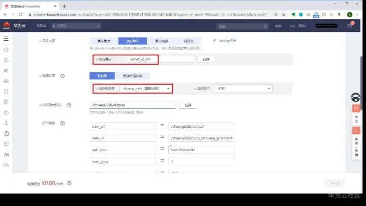 第三步,开始创建训练作业(ModelArts页面的左侧训练作业-创建),给项目起个名字,然后选择预置算法。针对当前数据集,这里建议选择resnet算法。数据集是之前创建好的内容,训练输出位置依旧选择output文件夹。参数需将batch有关的2个参数改成int型,max epoches改成200之后进行提交。