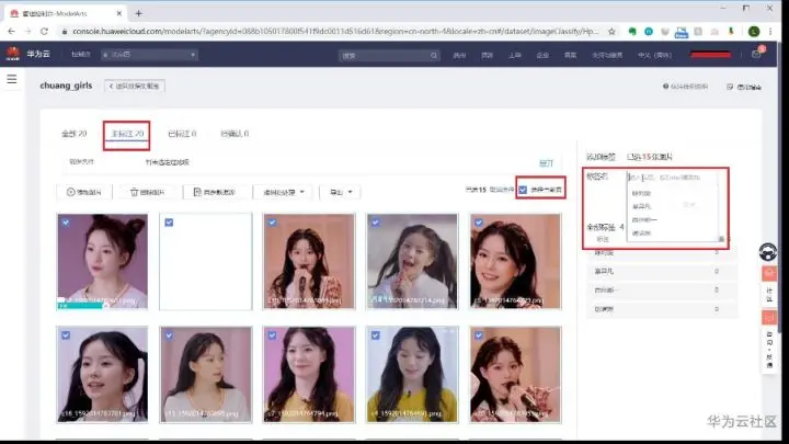 接下来,在添加标签集处,可把人物的名字加上去,点击创建。然后点击新建的数据集,进入后,点击右上角“开始标注”,添加图片,先批量上传第一个小姐姐的照片,然后到下图“未标注”部分,右侧全选标注为第一个小姐姐的名字。方便起见,对其他的照片也按人物分批上传,统一标记。全部标注完毕后,需点击发布否则训练集无法被使用。