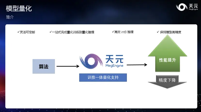 天元希望开发者能够用上经旷视内部长期工业验证的量化训练功能,并能够根据模型情况灵活配置不同量化模式,最大限度降低量化所带来的精度损失;另外,天元提供高效的原生 int8 推理能力。用户可以一站式完成量化训练加推理过程,免除框架间的转换,保持模型精度。