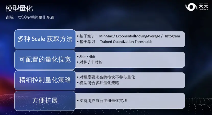 天元 Beta 版提供的量化接口让开发者能够使用不同的 Scale 获取方法,多种基于统计或基于学习的方式,以及灵活配置量化策略、位宽。此外,由于量化方法在整体上仍处于发展当中,因此天元量化接口的设计宗旨是便于扩展。通过支持用户自行注册量化实现,便于兼容各类特殊硬件和新的量化方法。