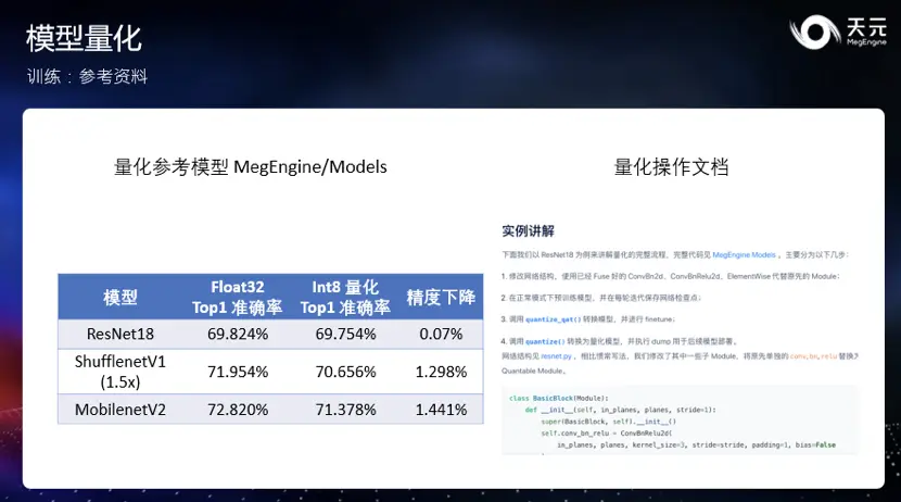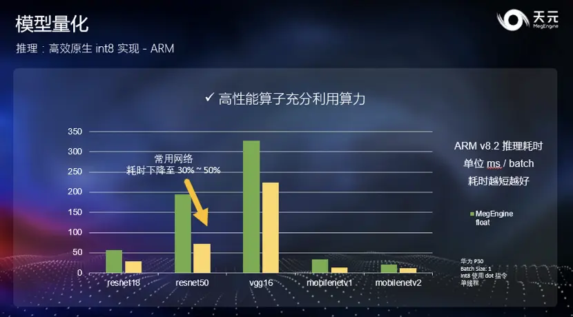 模型量化的推理方面,在天元 Beta 版中,量化模型的推理方法与浮点模型完全一致,开发者仅需直接读取序列化模型执行,在各个平台上都可以直接载入并进行高效推理。