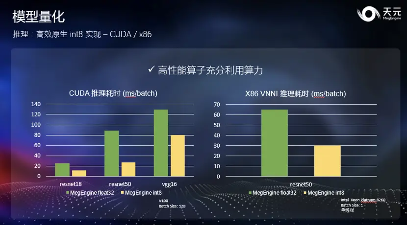 为此,天元在各主流计算平台上提供的高效 int8 实现,让开发者不再需要面对上述痛苦,保证开发者用天元框架训练后能够直接进行推理部署。