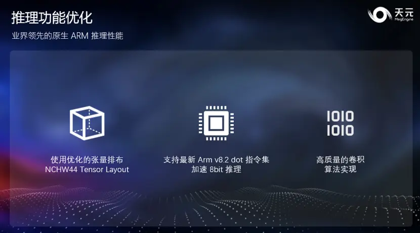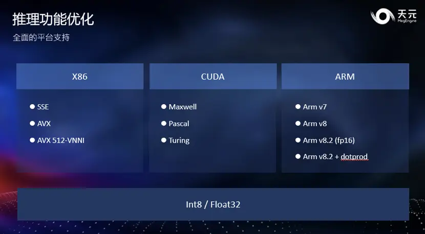 添加对ARM CPU的支持。天元添加了对ARM CPU的支持,在ARM、CUDA、X86三个主流计算平台上都提供了经过深度优化的 kernel 实现,结合天元优异的计算图优化技术,在量化、浮点模型上均提供了业界领先的计算性能和内存显存占用。