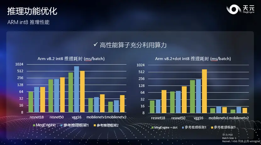 另外,借助 ARM 的 dot 指令,天元 ARM 上的 int8 推理在 ResNet 上从 64ms 降低到了 30ms 以内,在一系列常用网络上都可以获得两倍以上的大幅度加速。因此如果手上有支持 dotprod 指令的设备,开发人员可以在天元的支持下获得巨大的性能提升。