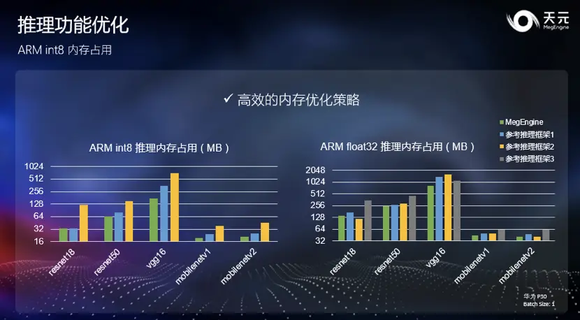 天元仅依靠通用优化策略,便实现了对任意模型结构优良的优化表现,使得框架无需针对网络结构进行特殊优化。各领域开发者在使用自己的模型结构时也能有较低的内存占用,从而提高竞争力。