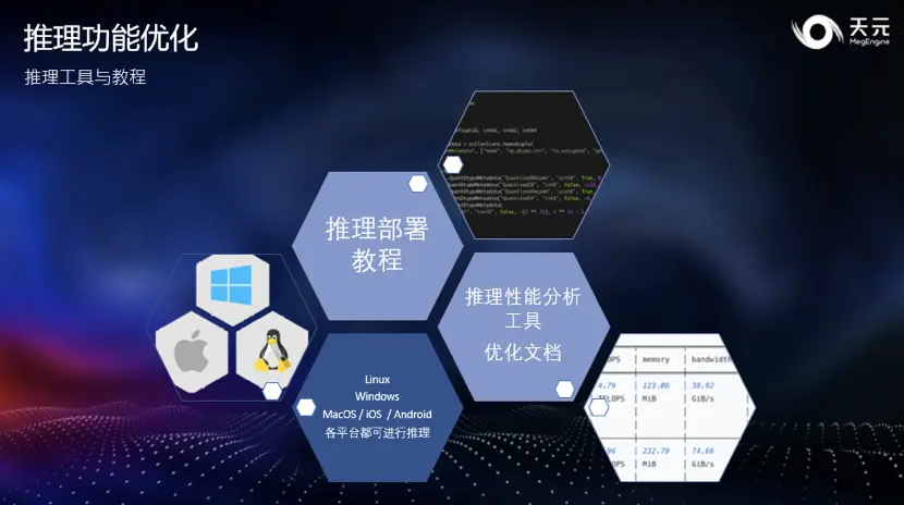 最后天元针对跨平台编译进行优化,开发者可以利用天元在 Linux / Windows /macOS / iOS / Android 上进行推理。