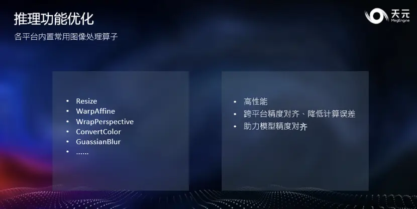 在深度学习模型的落地中,一个重要的步骤称为 “对分”,它能确保模型训练与最终推理的行为完全一致。天元提供的 CV 算子在各平台间对齐精度,尽全力避免训练与推理的差异,降低其中的误差,从而显著降低对分的成本,助力模型快速落地。