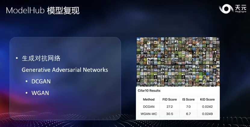 另外,本次还更新了两个生成对抗网络。在 CIFAR10 数据集上复现了 DCGAN 和 WGAN 两篇论文的工作,各项评估指标都达到复现的 SOTA 水平。