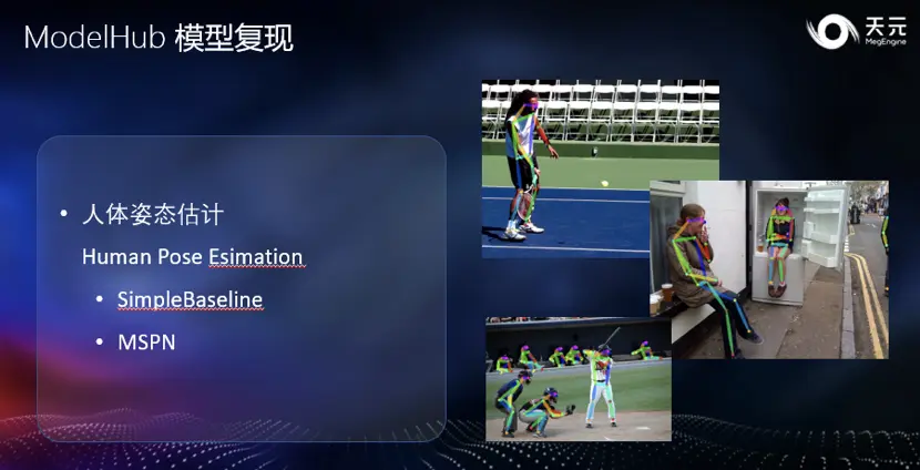 此外,天元本次提供了两个人体骨骼点复现模型,分别是经典的 Simple Baseline 和 MSPN 网络,MSPN 是旷视在 CVPR 2019 上提出的高效人体姿态估计网络。这两个模型都提供了基于 COCO 数据集的预训练权重,便于大家进行更多实验。